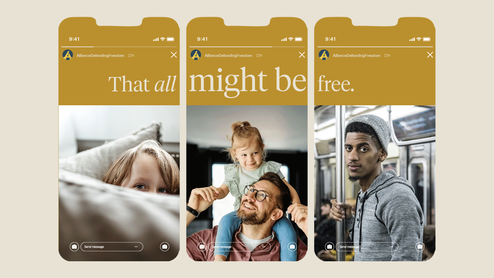 For this freelance project with Alliance Defending Freedom—the world’s largest legal organization dedicated to protecting religious freedom, free speech, the sanctity of life, parental rights, and God’s design for marriage and family—I was tasked with designing the typography for a campaign video. My approach explored creative ways for the type to interact with the background imagery, though the client ultimately chose a clean, minimalist style to prioritize clarity and professionalism. In addition to the video, I developed unused concepts for outdoor posters and social media posts, demonstrating how the typographic system could scale across multiple campaign assets while reinforcing the core message.